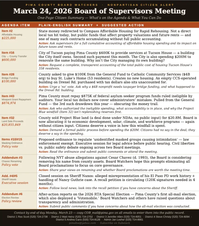 A local advocacy group has been faithfully monitoring local government (Pima County Board of Supervisors) in the Tucson area scouring the upcoming meeting agenda and distributing a watch-sheet of sorts to a mailing list. Citizens are encouraged to reach out to their supervisors about action items of concern via email.